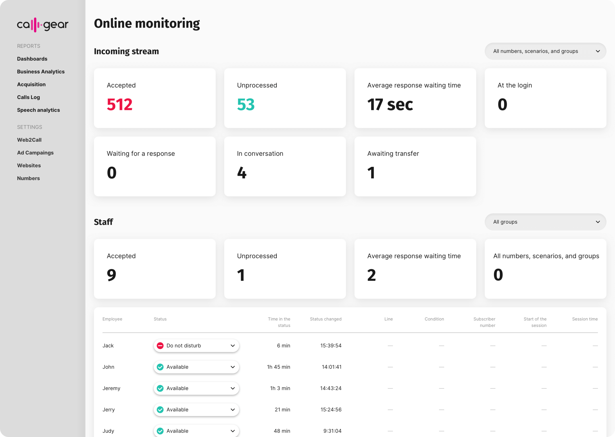 With the implementation of CallGear, the senior manager of the group could now assess the workload of all employees, see their status, and analyze the number of calls in the queue. During peak hours, the senior manager could bring in new operators or connect employees from other departments.